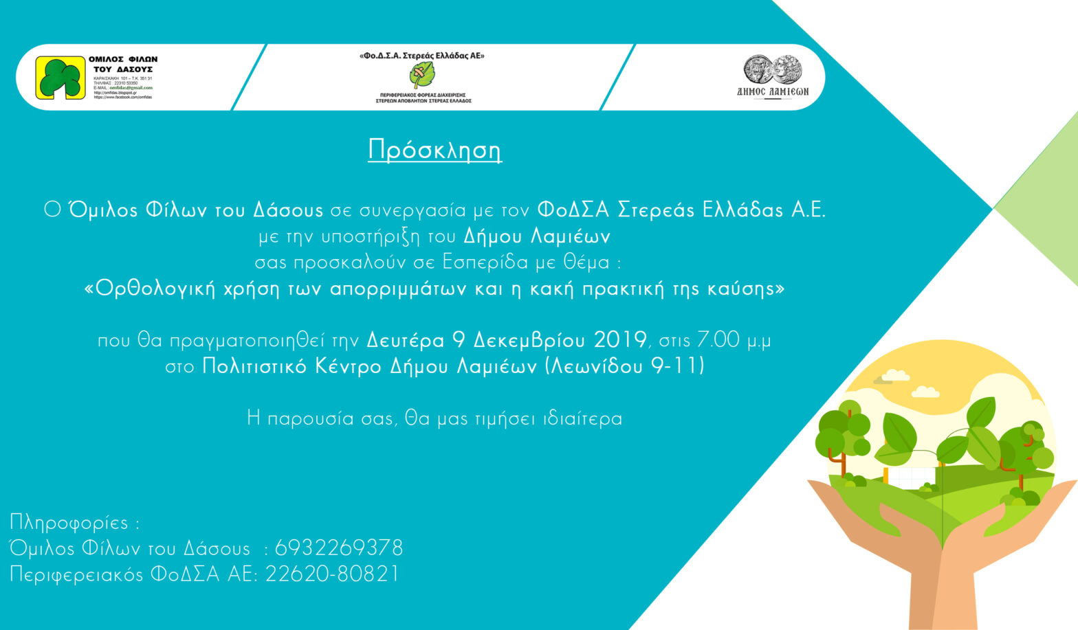 Πραγματοποιήθηκε με επιτυχία την Δευτέρα 9 Δεκεμβρίου 2019 η Εσπερίδα που διοργάνωσε ο Όμιλος φίλων του δάσους σε συνεργασία με τον ΦοΔΣΑ Στερεάς Ελλάδας Α.Ε και την υποστήριξη του Δήμου Λαμιέων, με θέμα «Ορθολογική χρήση των απορριμμάτων και η κακή πρακτική της καύσης».