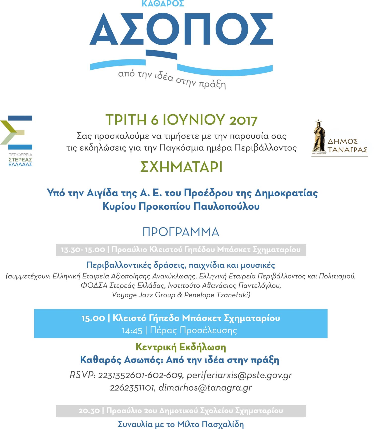 Με μεγάλη επιτυχία πραγματοποιήθηκαν την Τρίτη 6 Ιουνίου στο Σχηματάρι, στα πλαίσια της Παγκόσμιας ημέρας για το περιβάλλον οι εκδηλώσεις με θέμα: «Καθαρός Ασωπός από την ιδέα στην πράξη».